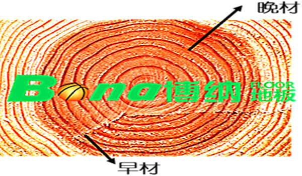 早材,是指溫帶和寒帶的樹種,通常生產(chǎn)季節(jié)早期(春天和夏天)生長的部分,質(zhì)地較松軟;顏色淺。晚材,是指溫帶和寒帶的樹種,通常生產(chǎn)季節(jié)晚期(秋季及冬天)生長的部分,質(zhì)地較硬實,顏色也較深。