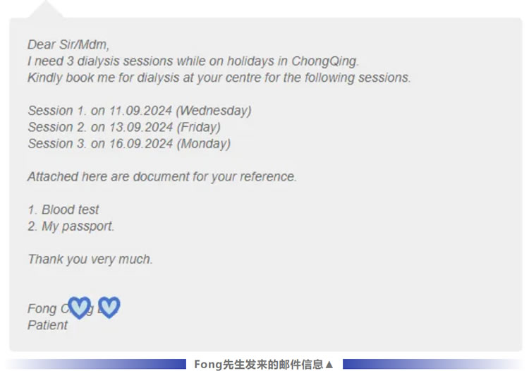 據(jù)了解,F(xiàn)ong先生今年69歲,接受透析治療已有10年。作為一名旅游愛好者,他本次不遠(yuǎn)千里前來中國(guó),只為領(lǐng)略山城重慶的獨(dú)特魅力,但如何定期進(jìn)行透析治療卻成了難題。通過網(wǎng)上搜索以及海外腎友圈分享的口碑了解到山外山公司及其血液透析中心后,立馬聯(lián)系了山外山國(guó)際部的工作人員,最終確定在重慶山外山血液透析門診部開展一周3次的透析治療。