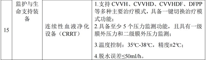 根據(jù)此前國(guó)家工信部及衛(wèi)健委發(fā)布的《2024年高端醫(yī)療裝備推廣應(yīng)用項(xiàng)目申報(bào)工作的通知》,申報(bào)監(jiān)護(hù)與生命支持裝備項(xiàng)目中的連續(xù)性血液凈化設(shè)備(CRRT)需滿足以下四個(gè)要求: