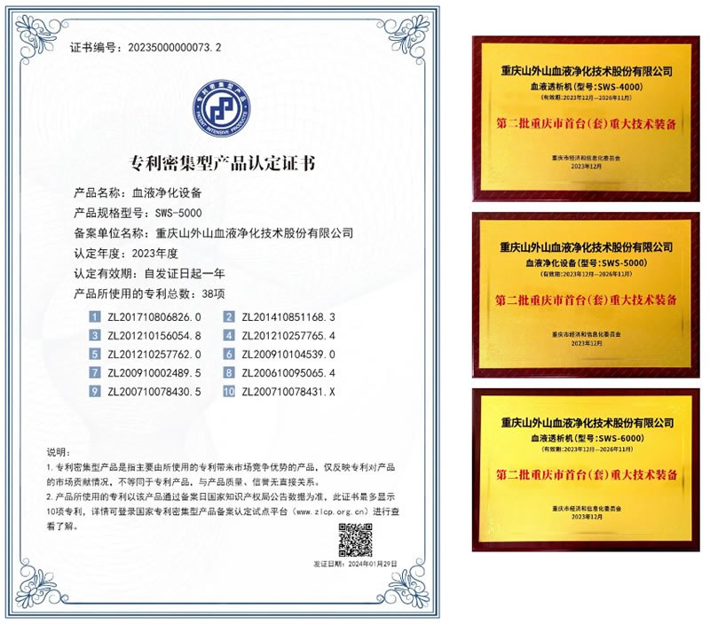 除了入選國(guó)家高端醫(yī)療裝備推廣應(yīng)用項(xiàng)目目錄,SWS-5000連續(xù)性血液凈化設(shè)備還通過(guò)了首批國(guó)家專利密集型產(chǎn)品認(rèn)定,與山外山SWS-4000、SWS-6000血液透析機(jī)一同被認(rèn)定為第二批重慶市首臺(tái)(套)重大技術(shù)裝備產(chǎn)品。這些先進(jìn)而精良的血液凈化設(shè)備,鐫刻著山外山的技術(shù)創(chuàng)新力量,也見證了中國(guó)追趕世界的速度。