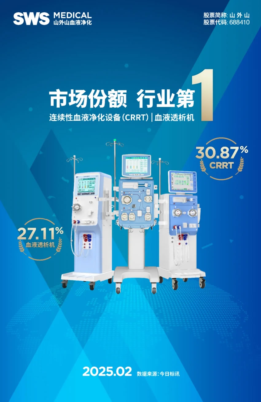 尤為值得一提的是,2025年2月,山外山連續(xù)性血液凈化設(shè)備(CRRT)和血液透析機分別以30.87%、27.11%的超高市場份額雙雙沖上冠軍寶座,均躍居行業(yè)第一。