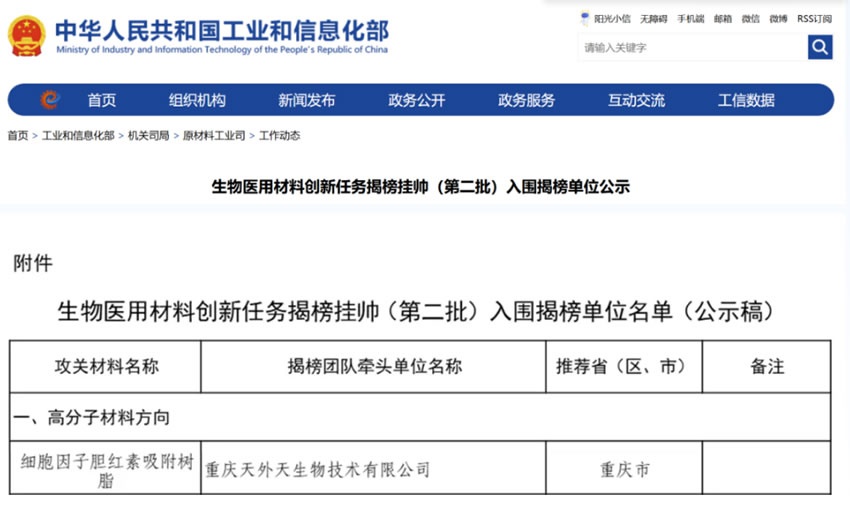 2025年8月26日,工業(yè)和信息化部、國家藥品監(jiān)督管理局聯(lián)合公示了《生物醫(yī)用材料創(chuàng)新任務(wù)揭榜掛帥(第二批)入圍揭榜單位名單》。重慶山外山血液凈化技術(shù)股份有限公司(“山外山”,科創(chuàng)板股票代碼:688410)全資子公司 —— 重慶天外天生物技術(shù)有限公司(簡稱“天外天”),憑借“細胞因子膽紅素吸附樹脂”成功入圍第二批國家生物醫(yī)用材料創(chuàng)新任務(wù)“揭榜掛帥” 單位。