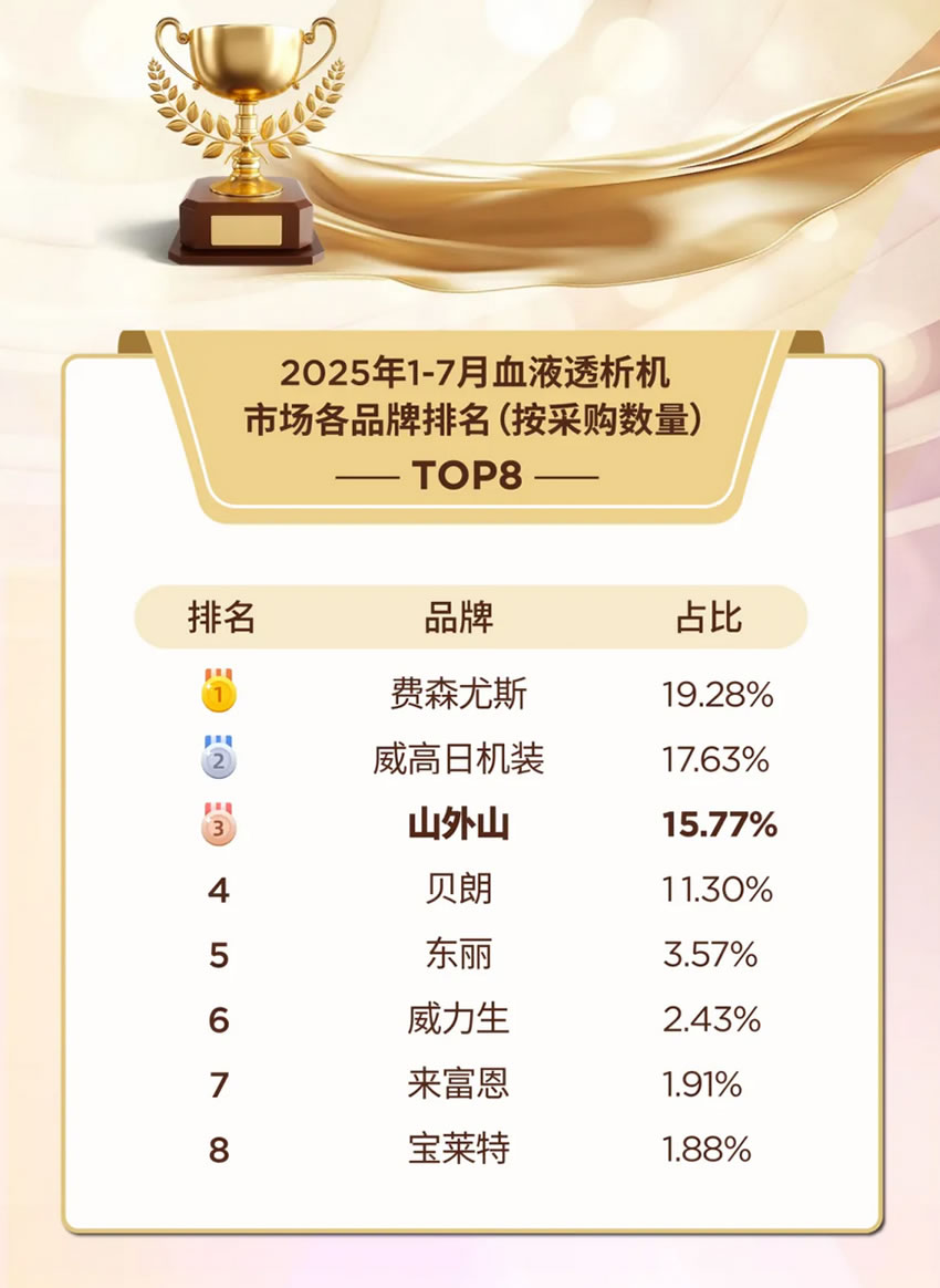 從單月的市場突圍到長期的穩(wěn)健增長,從技術(shù)創(chuàng)新到全產(chǎn)業(yè)鏈服務(wù)升級,山外山以“技術(shù)+服務(wù)”、“國內(nèi)+國際”雙輪驅(qū)動戰(zhàn)略,正在重新定義國產(chǎn)血液凈化設(shè)備的行業(yè)地位。